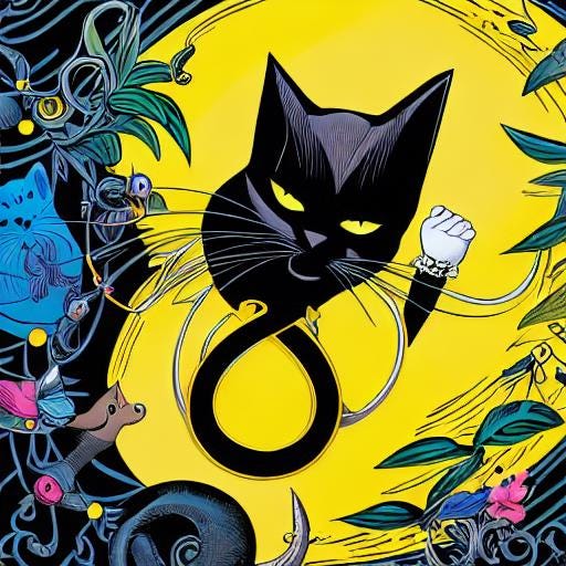 Vanaf de zijkant sprong de kat weer tevoorschijn en stond nu op achterpoten vóór de gouden gordijnen. Hij bracht met een haast menselijk gebaar één poot voor zijn bek en beduidde dat het publiek stil moest blijven, omdat het verhaal verder ging. Met een onwaarschijnlijke luchtsprong verdween hij naar boven.