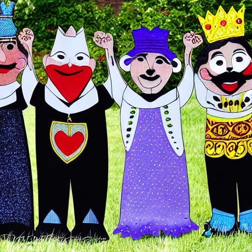 Ze waren de nieuwe koning en koningin geworden. De oude koning en koningin stonden als hofhouding en bogen voor ze.