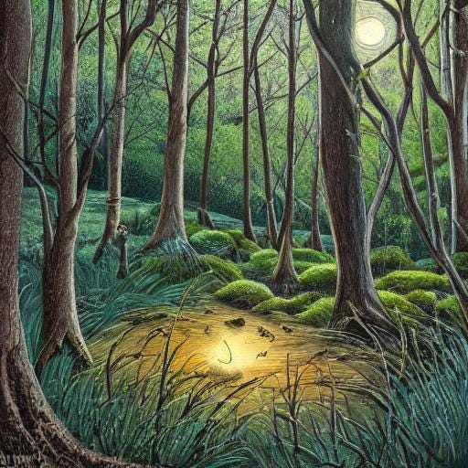 Het werd snel nacht. Het licht van de maan scheen koel en toverachtig tussen de stammen. De kikker zat roerloos. De dwaas lag midden op het toneel te slapen en droomde.