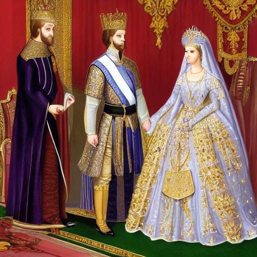 En daar traden de prins en de prinses de troonzaal binnen. Het paar liep naar de troon. De prins boog lichtjes naar de prinses en kuste haar hand. De prinses maakte een reverence naar de prins.