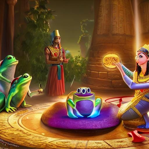 Op de plaats waar zojuist nog de prins gelegen had zat een felgroene kikker. Deze sprong meteen op en in het rond. De koningin deinsde achteruit en sloeg de handen voor haar gezicht. Ze stapte van haar troon, liep naar de kikker en probeerde deze te vangen. Maar de kikker sprong zijdelings weg en landde met één luchtsprong bovenop de troon van de koningin. Ze keek verbijsterd toe. De koning kwam nu in actie. Hij sloeg de kikker met één mep van de troon van zijn gemalin af. Maar het gevolg daarvan was alleen dat de kikker nu op het hoofd van de koning sprong en op de binnenplaats kinderen oneerbiedig begonnen te lachen en de kikker begonnen aan te moedigen. De koning werd daar alleen maar bozer van. Het was natuurlijk majesteitsschennis maar hij had geen macht over de zaal en de kinderen. Hij sloeg nijdig de kikker van zijn hoofd tegen de grond. Maar het dier sprong telkens weer terug. De koningin keek ondertussen nog steeds verlamd van schrik toe hoe het beest met haar gemaal in gevecht was en hem bedreigde. Het publiek was duidelijk op de hand van de kikker, hetgeen de gemoederen in de troonzaal helemaal niet ten goede kwam. Hoe moest het nu verder met dit koninkrijk?