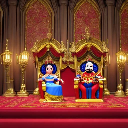 In de gouden troonzaal zitten tussen beschilderde zuilen de koning en de koningin op hun tronen. Ze luisteren naar hoofse muziek die op een viool gespeeld wordt.