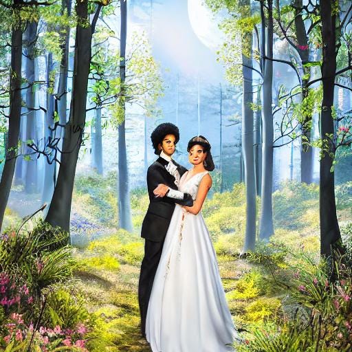 De koningin liep naar ze toe en omarmde ze. Ze wees naar de tronen en nodigde prins en prinses uit dat zij nu op de tronen moesten gaan zitten. Het jonge echtpaar liep naar de tronen. Ze bleven een moment staan en keken de zaal rond en naar de omstanders.