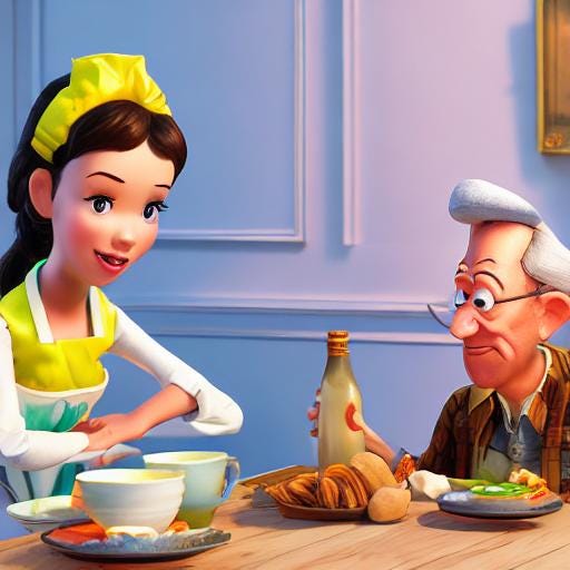 Er klonk weer vioolmuziek. Het was hetzelfde menuet waarop in de vorige scène de kat en de prins hadden gedanst. De kikker begon op tafel erop te dansen terwijl het melkmeisje dromerig op de maat meewiegde. De kikker sprong op de grond en nu dansten ze samen. Hij maakte grappige bewegingen en danste op zijn achterpoten. Midden in de dans maakte hij een zwierige buiging.