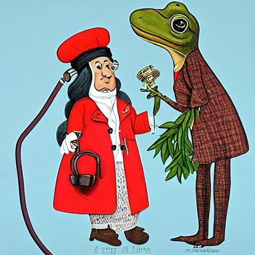 Het vrouwtje liep naar de tafel waar de kikker nog op zat. Ze haalde de stethoscoop tevoorschijn om het beest te onderzoeken. Die ging behulpzaam voor haar staan, waarbij zijn gespikkelde buik goed te zien was en haast op een kostuum leek. Hij gaf zich als een heuse patiënt over aan het medisch onderzoek.